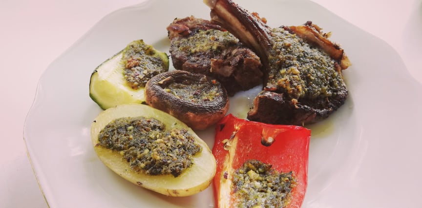 Ջեռոցի թիթեղի վրա փայլաթիթեղ դրեք: Գառան կողիկները գրիլ-թավայի վրա երկու կողմից կարմրացնելուց հետո դրեք տապակի վրա: Կողքերը շարեք երկու մասի բաժանած մատղաշ կարտոֆիլը, դդմիկը, սմբուկը, սնկի գլխիկները: Բանջարեղենի վրա քիչ աղ եւ պղպեղ ցանեք: