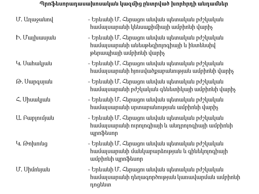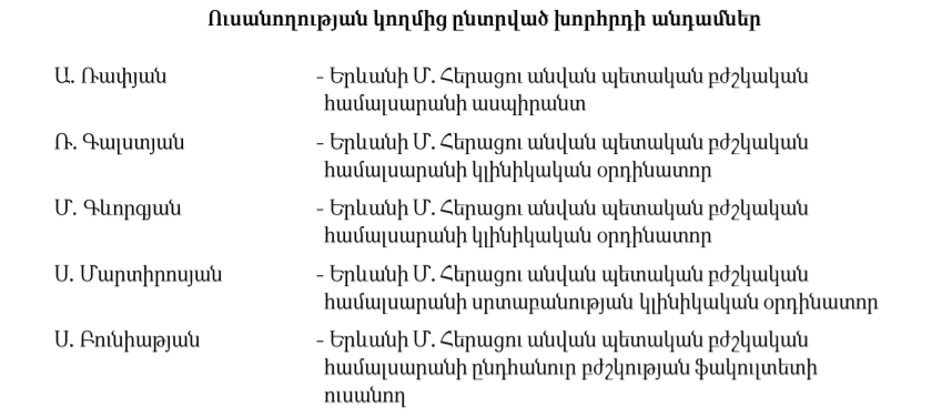 Երեւանի Մխիթար Հերացու անվան պետական բժշկական համալսարանի հոգաբարձուների խորհրդի անդամների թվում են պաշտոնյաներ ՀՀ շրջակա միջավայրի, արտաքին գործերի, պաշտպանության, կրթության, գիտության, մշակույթի եւ սպորտի, աշխատանքի եւ սոցիալական հարցերի նախարարություններից: Հոգաբարձուների խորհրդի կազմում են նաեւ բժշկական կենտրոնների տնօրեններ, անհատ բժիշկներ, բժշկական հասարակական կազմակերպությունների ղեկավարներ, համալսարանի ամբիոնների վարիչներ, ուսանող, օրդինատոր, ասպիրանտ (ցանկն ամբողջությամբ՝ կից լուսանկարներում):
