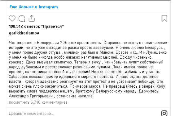 «Լուկաշենկոն իր ազգին մահակներով եւ ռետինե գնդակներով է սիրում: Մարդիկ իրավունք ունեն ցույց անելու»,-իր հերթին գրել է հայտնի բլոգեր, շոումեն Գարիկ Խարլամովը: