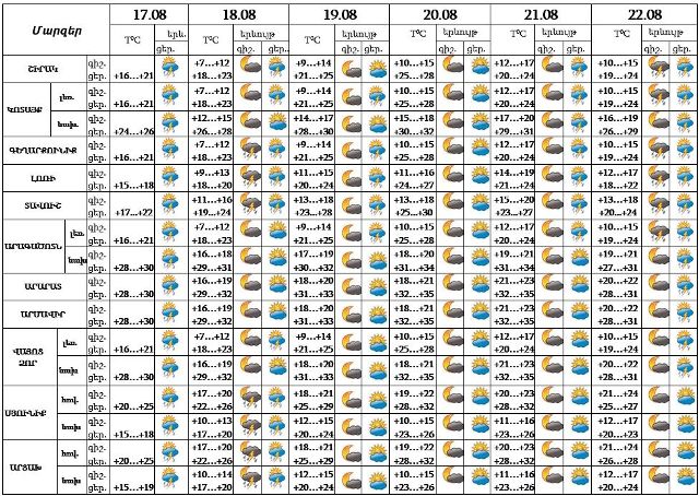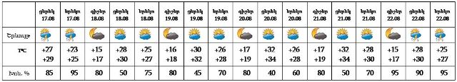 Oգոստոսի 17-ի ցերեկը, 22-ին ժամանակ առ ժամանակ շրջանների զգալի մասում, 18-19-ը, 21-ին՝ առանձին շրջաններում կեսօրից հետո սպասվում է անձրև և ամպրոպ, ամպրոպի ժամանակ՝ քամու ուժգնացում 15-20 մ/վ արագությամբ, առանձին վայրերում հնարավոր է կարկուտ: