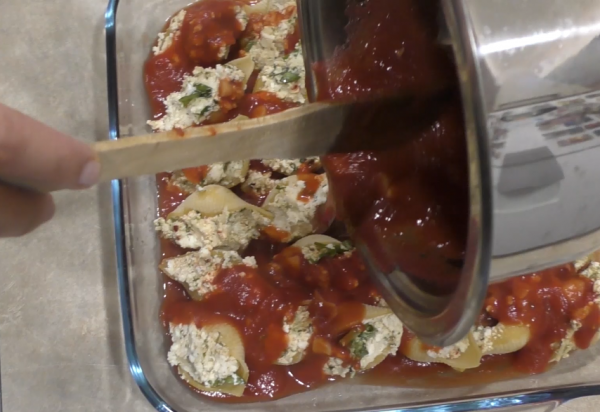 Լցոնած պաստաների վրա լցրեք թանձրուկը: Թանձրուկը պետք է ամբողջովին ծածկի ձեր կոնչիլյոնիները, եթե չի ծածկել, եւ չունեք այլեւս թանձրուկ, պարզապես մի քանի ճաշի գդալ տոմատի մածուկը բացեք ջրով, դա լցրեք: