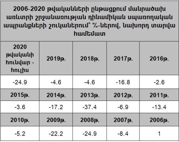 Այս ճգնաժամը մեծ ազդեցություն է թողել մանրածախ առևտրի վրա, և բնական է, որ դրանից անմասն չէին կարող մնալ սպառողական ապրանքների շուկաներում գործունեություն ծավալող փոքր և միջին առևտրականները։ Առավել մտահոգիչ է այն, որ մանրածախ առևտուրը սպառողական ապրանքների շուկայում շարունակում է նվազել, նույնիսկ այս տարվա մարտ-մայիս ամիսների ընթացքում տնտեսական գործունեության դադարից (Lockdown) հետո։ Մասնավորապես՝ 2020 թվականի հունիս ամսին սպառողական ապրանքների շուկաների առևտուրը նվազել է 7,4 տոկոսով, իսկ հուլիս ամսին անկումն ավելի է խորացել՝ հասնելով 9,3 տոկոսի։ Եվ, առհասարակ, վերջին 15 տարիների ընթացքում մանրածախ առևտուրը սպառողական ապրանքների շուկաներում անընդհատ կրճատվել է՝ ի հաշիվ խոշոր խանութների և դրանց ցանցերի ագրեսիվ տարածման․ ըստ էության՝ տեղի է ունեցել մանրածախ առևտրի մենաշնորհացում։