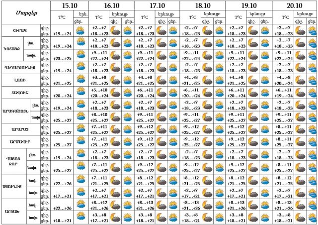 Հոկտեմբերի 15-ի ցերեկը, 16-20-ը սպասվում է առանց տեղումների եղանակ: