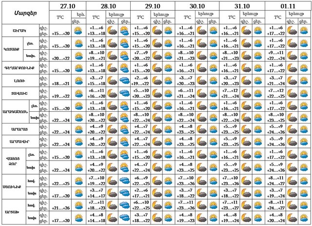 Օդի ջերմաստիճանը հոկտեմբերի 28-ի ցերեկը կնվազի 2-3, այնուհետև աստիճանաբար կբարձրանա 3-5 աստիճանով։