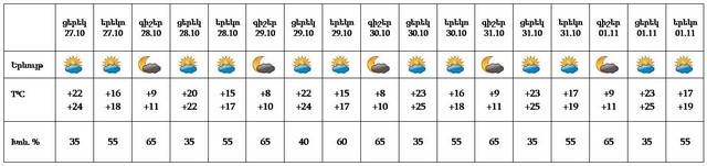 Հոկտեմբերի 27-ի ցերեկը, 28-31-ը, նոյեմբերի 1-ին սպասվում է առանց տեղումների եղանակ:
