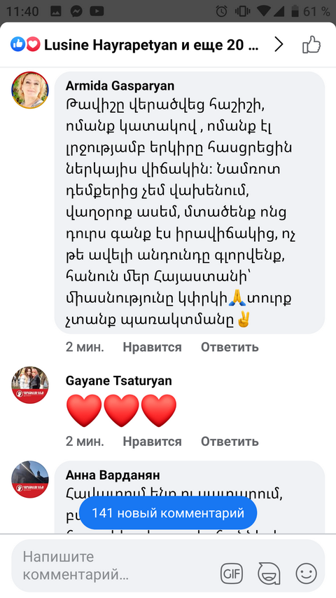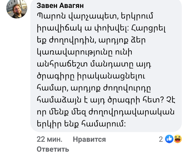 Գրառման ներքո առկա հազարավոր մեկնաբանություններում գերակշռում են ոչ թե այդ կետերի վերաբերյալ քննարկումները, այլ վարչապետին սատարող կամ հրաժարականը պահանջող կոչերը: