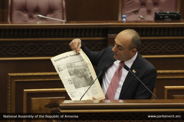 Որպես առանցքային ու կարեւոր դրվագ չենք կարող չհիշել 2018-ի մայիսի 1-ի Ազգային ժողովի նիստը, որի ժամանակ վարչապետի թեկնածու Նիկոլ Փաշինյանի առջեւ դրեցին իր «Հայկական ժամանակ» թերթի համարներից մեկը: Այն ժամանակ ՀՀԿ պատգամավոր Արման Սաղաթելյանն էր, որ հիշեցրեց ՀԺ-ում Փաշինյանի «հոդվածներից» մեկը՝ ԼՂ հարցի կարգավորման մասին ու մեջբերեց նրա խոսքերը. «Ես չեմ ընդունում այն տեսակետը, որ լավ դիվանագիտությունը կարող է այնպես անել, որ չվերադարձնենք տարածքները»: