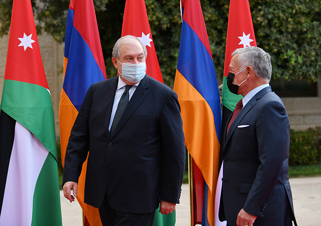 Հորդանանի թագավորական ընդունելությունների պալատում այսօր տեղի է ունեցել Հայաստանի նախագահի դիմավորման պաշտոնական արարողությունը։ Զինվորական նվագախմբի կատարմամբ հնչել են Հայաստանի և Հորդանանի Հաշիմյան Թագավորության պետական օրհներգերը: