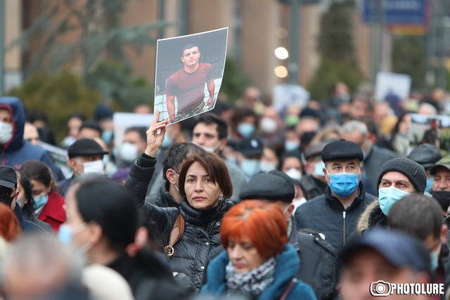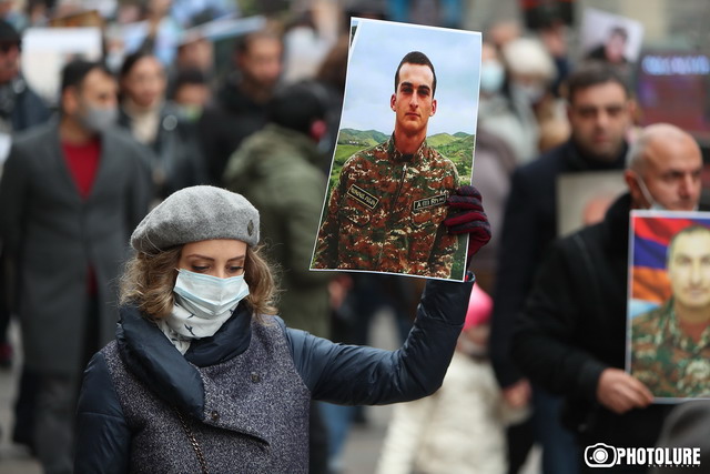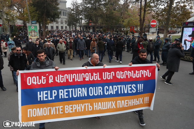 Armenian intellectuals hold a protest march heading to the Russian Embassy in Armenia protesting against international indifference and demanding Armenian captives and bodies of killed soldiers