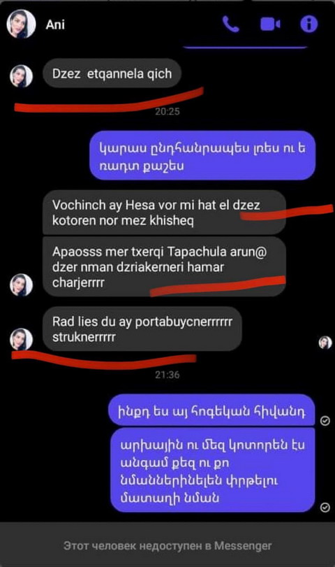 Նշենք, որ ավելի վաղ «Քաղաքացիական ֆորում» ՀԿ նախագահ Մարինե Մանուչարյանը ՖԲ էջում տեղեկացրել էր. «Վաղուց ուզում էի անդրադառնալ արցախցիներին օգնություն ցույց տվողներին: Նրանց շարքերում բազում են լուռումունջ աշխատող, հասնող կամավորներ, բարերարներ, պարզապես բարի մարդիկ: Աստված պահի բոլորին: Սովորաբար իրական օգնություն ցույց տվողներին հանրությունը, սոց ցանցերը չեն իմանում, իսկ այ լուն փիղ սարքողներին միանգամից նկատում ենք: Կոնկրետ էս օրինակին չէի անդրադառնա, եթե էս «օգնություն ցույց տվողը» յուր բարեգործությունը չփաթաթեր էժանագին պիառի, անձնական տեղեկատվության հրապարակման ու ատելության խոսքի հետ: Ուրեմն ոմն Անի Կարապետյան, ով աշխատում է, որպես քարտուղար, կամ օգնական Առողջապահության նախարարության պրոֆեսոր Յոլյանի անվան արյունաբանական կենտրոնում՝ ինչ որ շորեր ու փամփերսներ է տրամադրել մանկահասակ երեխաների մայր Սաթեն Ջալալյանին, հետո, ինչպես տեսնում եք սքրինից, բավականին անշնորհք տոնով պահանջել, որ Սաթենը էդ նվերների կողքը նկարի երեխաներին ու նկարն ուղարկի իրեն: Երբ Սաթենը հետաքրքրվել է, թե ինչու, Անին սկսել է վիրավորել ու անվանել Սաթենին թուրք, մնացածը երկխոսության սքրիններում երևում է: