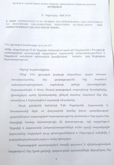 Սույն թվականի նոյեմբերի 9-ին Ադրբեջանի, Հայաստանի և Ռուսաստանի միջև ՀՀ վարչապետի կողմից խիստ գաղտնիության պայմաններում ստորագրված հայտարարությունը գնահատում ենք որպես հայ ժողովրդի համար նվաստացուցիչ մի փաստաթուղթ, որի արդյունքում Արցախի և Հայաստանի Հանրապետություններն ունեն զգալի տարածքային կորուստներ, հայկական զույգ պետություններում և Սփյուռքում ստեղծվել է բարոյահոգեբանական բարդ ու ծանր մթնոլորտ։