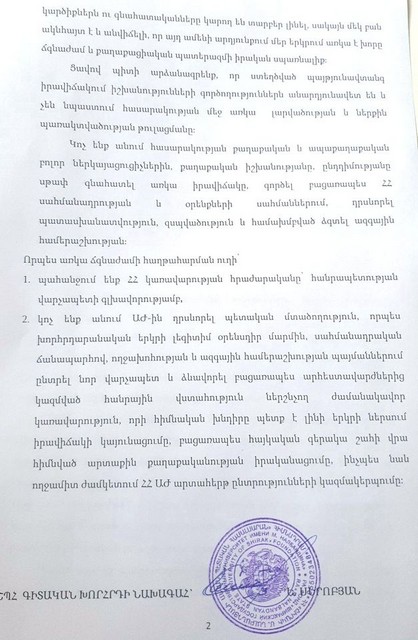 2.կոչ ենք անում ԱԺ-ին դրսևորել պետական մտածողություն, որպես խորհրդարանական երկրի լեգիտիմ օրենսդիր մարմին, սահմանադրական ճանապարհով, ողջախոհության և ազգային համերաշխության պայմաններում ընտրել նոր վարչապետ և ձևավորել բացառապես արհեստավարժներից կազմված հանրային վստահություն ներշնչող ժամանակավոր կառավարություն, որի հիմնական խնդիրը պետք է լինի երկրի ներսում իրավիճակի կայունացումը, բացառապես հայկական գերակա շահի վրա հիմնված արտաքին քաղաքականության իրականացումը, ինչպես նաև ողջամիտ ժամկետում ՀՀ ԱԺ արտահերթ ընտրությունների կազմակերպումը: