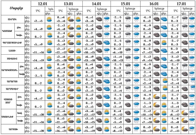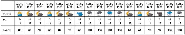 Հունվարի 12-ի ցերեկը, 13-ին, 16-ին սպասվում է առանց տեղումների եղանակ։ Հունվարի 14-ի ուշ երեկոյան ժամերին, 15-ին, 17-ին ժամանակ առ ժամանակ սպասվում են տեղումներ։
