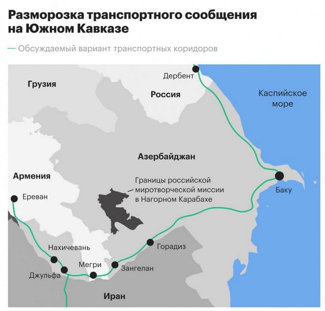 Հունվարի 27-ին Ռուսաստանի, Հայաստանի և Ադրբեջանի փոխվարչապետերը նախատեսում են հանդիպել Մոսկվայում՝ քննարկելու Հարավային Կովկասում տրանսպորտային կապերի շինարարության հարցը: Այս մասին հայտնում է RBK-ն՝ վկայակոչելով Հայաստանի և Ռուսաստանի կառավարություններում երկու աղբյուրներ: Ռուսական կողմից բանակցություններին կմասնակցի Ալեքսեյ Օվերչուկը, Հայաստանից՝ Մհեր Գրիգորյանը, Ադրբեջանից՝ Շահին Մուստաֆաևը, հայտնել են գործակալությանը: