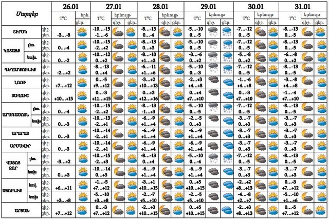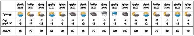 Հունվարի 26-ի ցերեկը, 27-28-ը, 30-31-ը սպասվում է առանց տեղումների եղանակ, 29-ին սպասվում է թույլ ձյուն: