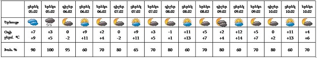 Փետրվարի 5-ին` կեսօրից հետո սպասվում է անձրև, 6-10-ը սպասվում է առանց տեղումների եղանակ։