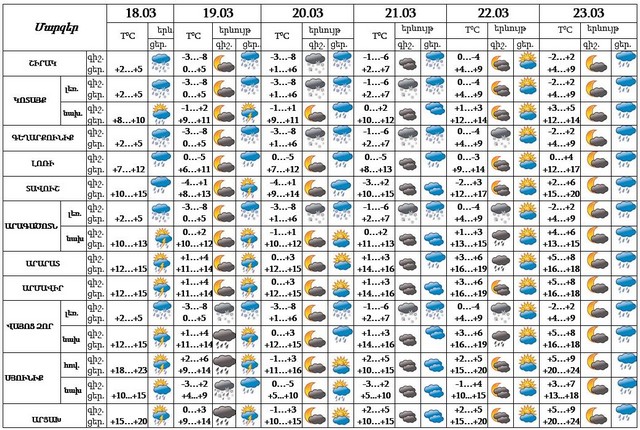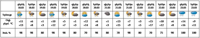 Մարտի 18-ի ցերեկը, 19-21-ը, 22-ի գիշերը, 23-ի ցերեկը ժամանակ առ ժամանակ դադարներով սպասվում է կարճատև անձրև, հնարավոր է ամպրոպ: Մարտի 22-ի ցերեկը, 23-ի գիշերը սպասվում է առանց տեղումների եղանակ: