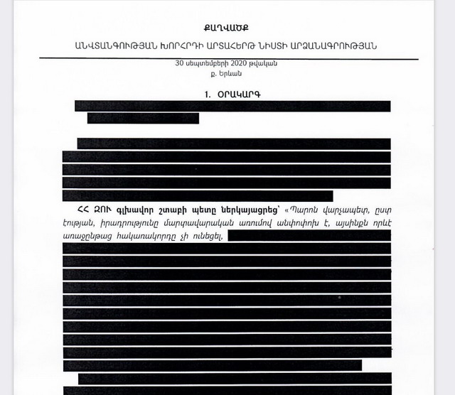 Սակայն Օնիկ Գասպարյանի նշանակմանը հաջորդած ԱԽ-ի՝ հունիսի 19-ի նիստին պարոն Գասպարյանը զեկուցողների ցանկում չի եղել (նիստում երկու զեկուցող է եղել), ինչը հավաստում է ԱԽ-ի նիստի արձանագրությունը (տես՝ քաղվածք № 1) :