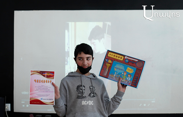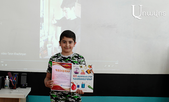 Մրցույթի հաղթողներից Գանձաքարի 7-րդ դասարանի աշակերտ Տարոն Խաչինյանը պատրաստ էլ հրթիռ, որը ցույց էր տալիս ռեակտիվ շարժումը։