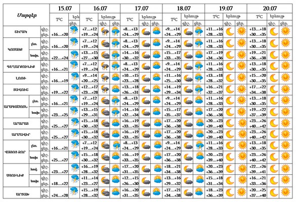 Սահարա անապատից արևադարձային տաք օդային հոսանքների ներթափանցմամբ պայմանավորված հուլիսի 16-20-ին հանրապետության ողջ տարածքում օդի ջերմաստիճանը աստիճանաբար կբարձրանա 14-16 աստիճանով, հուլիսի 19-20-ին Արարատյան դաշտում և նրա նախալեռներում, Վայոց Ձորի նախալեռներում, Սյունիքի հովտային շրջաններում և Երևանում ցերեկային ժամերին հասնելով +40․․․+42 աստիճանի։