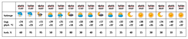 Օդի ջերմաստիճանը հուլիսի 16-20-ին՝ ցերեկն աստիճանաբար կբարձրանա 14-16 աստիճանով։