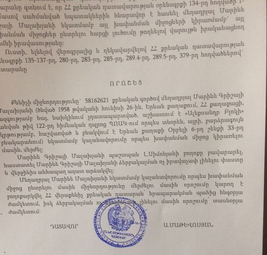 Փաստաբան Լիպարիտ Սիմոնյանի ֆեյսբուքյան էջից տեղեկանում ենք, որ Երևան քաղաքի ընդհանուր իրավասության դատարանի դատավոր Աննա Մաթևոսյանը մերժել է Երևանի թիվ 122 դպրոցի նախկին տնօրեն Մարինե Մալախյանին կալանավորելու վերաբերյալ քննիչի միջնորդությունը։