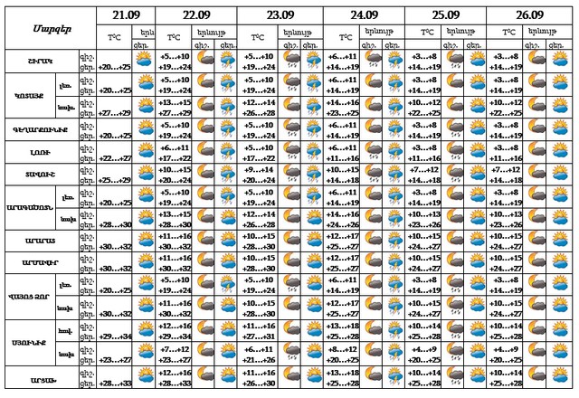 Սեպտեմբերի 21-ի և 25-ի ցերեկը, 26-ին սպասվում է առանց տեղումների եղանակ: