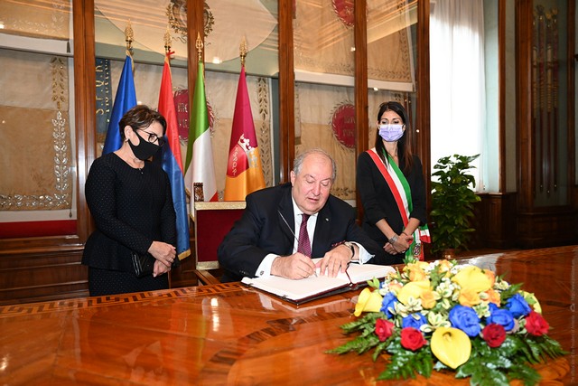 Հանդիպման ավարտին նախագահ Սարգսյանը գրառում է կատարել Հռոմի քաղաքապետարանի Պատվավոր հյուրերի գրքում։