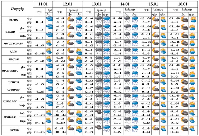 Հունվարի 11-ի ցերեկը, 12-ին, 15-16-ին սպասվում է առանց տեղումների եղանակ: