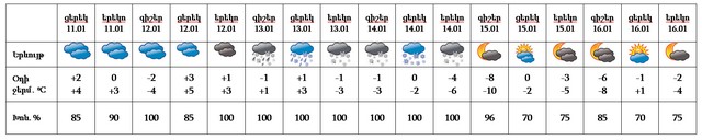 Հունվարի 12-ին երեկոյան ժամերին առանձին շրջաններում, 13-14-ին շրջանների զգալի մասում սպասվում են տեղումներ և մառախուղ, 13-ին լեռնային և նախալեռնային, 14-ին բոլոր շրջաններում` ձյան տեսքով: