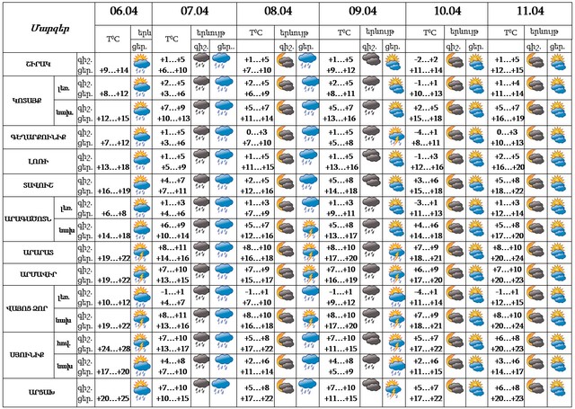 Օդի ջերմաստիճանն ապրիլի 06-07-ին ցերեկն աստիճանաբար կնվազի 4-6, Լոռիում, Տավուշում, Սյունիքում և Արցախում՝ 7-10 աստիճանով, այնուհետև նույնքան կբարձրանա: