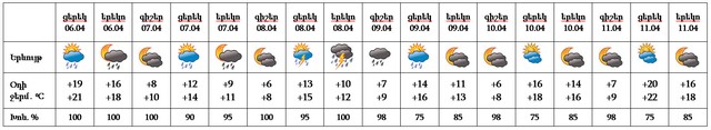Ապրիլի 06-ի ցերեկը, 07-ին, 08-ի ցերեկը, 09-ին սպասվում է անձրև: