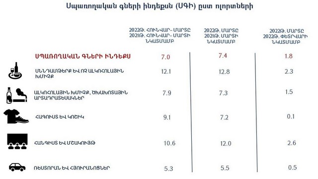 Սպառողական գների ինդեքսը 2022թ․ հունվար–մարտին նախորդ տարվա նույն ժամանակահատվածի համեմատ կազմել է 7.0%