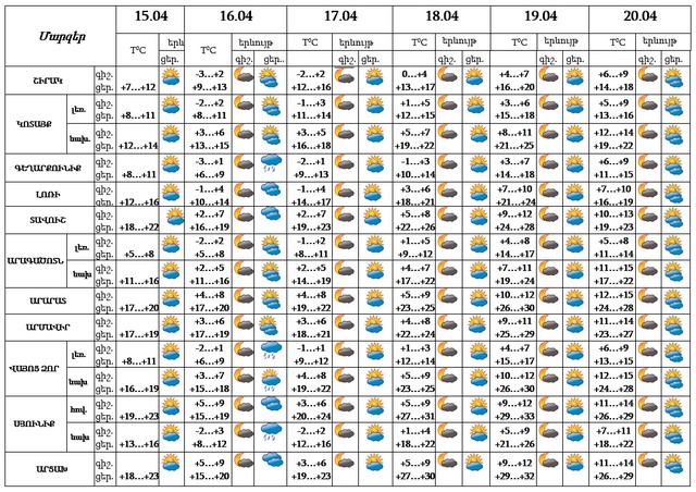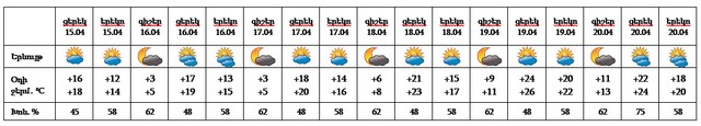 Ապրիլի 15-ի ցերեկը, 16-ի գիշերը, 17-20-ին սպասվում է առանց տեղումների եղանակ: