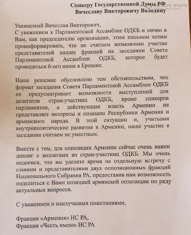 Իշխանության հետ կապված լրատվամիջոցներից մեկը հրապարակել է «Պատիվ ունեմ» եւ «Հայաստան» խմբակցության դիմումը Հայաստան ժամանած ՌԴ ԴԺ Պետական դումայի նախագահ Վյաչեսլավ Վոլոդինին։