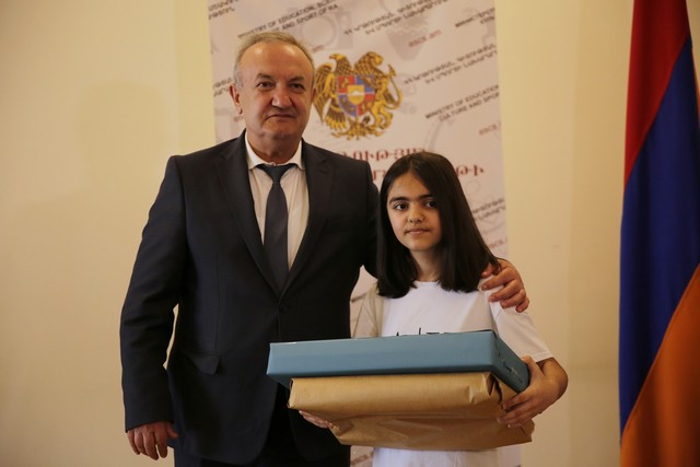 Այնուհետև Վահրամ Դումանյանը փոքրիկ Վիկային հանձնել է համակարգիչն ու համակարգչային պայուսակը: