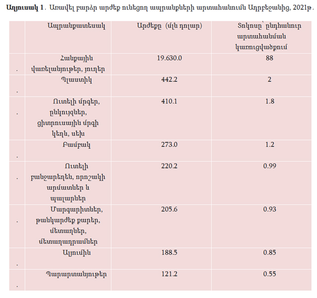 Հայաստանի Հանրապետությունից արտահանվող ապրանքների շարքում ամենամեծ չափաբաժինը ձևավորել է հանքահումքային արտադրանքը, որը դոլարային արտահայտությամբ կազմել է 982.2 մլն, իսկ Հայաստանից արտահանման կառուցվածքում նրա կշիռը կազմել է 32,4 տոկոս: 2021թ․ հանքահումքային արտադրանքի դոլարային արտահայտությամբ ծավալն աճել է 20,6 տոկոսով, որն էլ իր հերթին կապված է համաշխարհային շուկաներում պղնձի պահանջարկի մեծացման արդյունքում տեղի ունեցած կտրուկ թանկացմամբ։ 2021թ․ նախորդ տարվա նույն ժամանակահատվածի համեմատ պղնձի գինը գրեթե կրկնապատկվել է, և 2022թ․ էլ այդ աճը շարունակվում է։