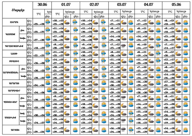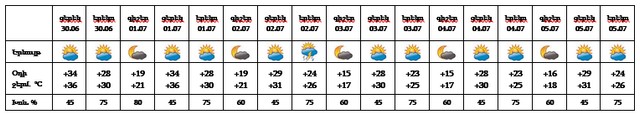 Հունիսի 30-ի ցերեկը, հուլիսի 1-ին, 3-5-ին սպասվում է առանց տեղումների եղանակ: