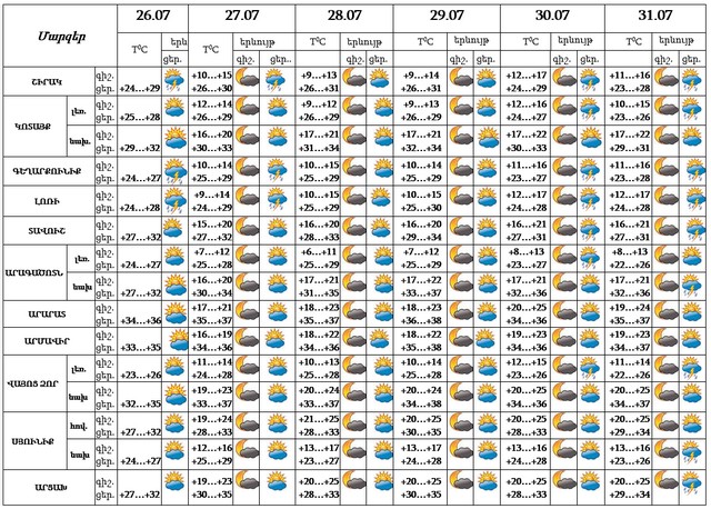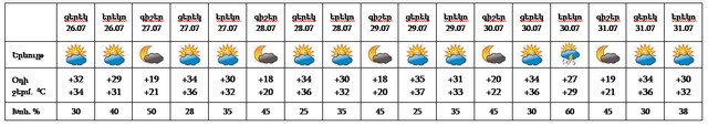 Հուլիսի 26-27-ին, 30-31-ին կեսօրից հետո առանձին շրջաններում սպասվում է կարճատև անձրև և ամպրոպ: Հուլիսի 28-29-ին սպասվում է առանց տեղումների եղանակ: Քամին՝ հարավարևմտյան 2-5մ/վրկ: Արմավիրում, Արագածոտնի և Կոտայքի նախալեռներում երեկոյան ժամերին սպասվում է քամու ուժգնացում 16-21 մ/վրկ։ Օդի ջերմաստիճանը հուլիսի 26-29-ին աստիճանաբար կբարձրանա 4-6 աստիճանով: