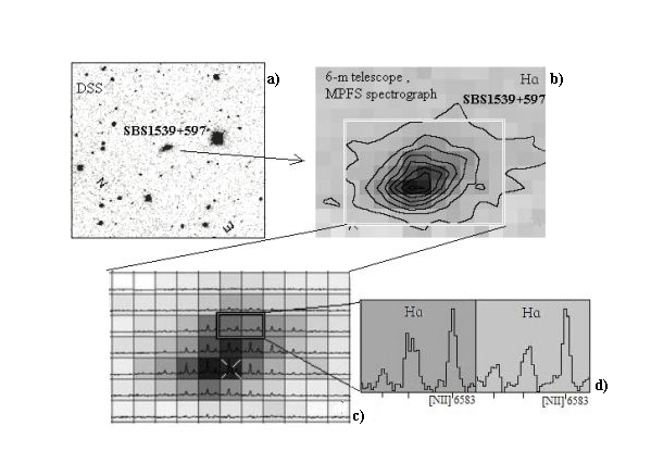 Նկար1. Ուսումնասիրվող SBS1539+597 գալակտիկայի պատկերը՝ a) DSS ( Digitized Sky Survey) շրջահայության քարտեզի վրա և b) ջրածնի բալմերյան Hα գծում ՝ ըստ MPFS բազմաբիբ սպեկտրոգրաֆի օգտագործմամբ 6-մ դիտակով ստացված տվյալների. c)նախորդ նկարում սպիտակով շրջանագծված 11”x7” տիրույթի պատկերը, որը համապատասխանում է Hα և [NII]6548,6583 իոնիզացված ազոտի գծերն ընդգրկող սպեկտրի հատվածին. d) նախորդ նկարից՝ տուրբուլենտության տիրույթ հանդիսացող երկու էլեմենտները խոշորացված տեսքով: