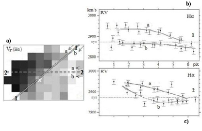 Նկար 2. a) Ջրածնի բալմերյան Hα գծով հաշվարկած SBS1539+597 գալակտիկայի տեսագծային արագությունների դաշտը. b) և c) արագության փոփոխությունները արտացոլող կորեր, ստացված դաշտում նշված 1-ին և 2-րդ առանցքների շրջակայքում, համապատասխանաբար: