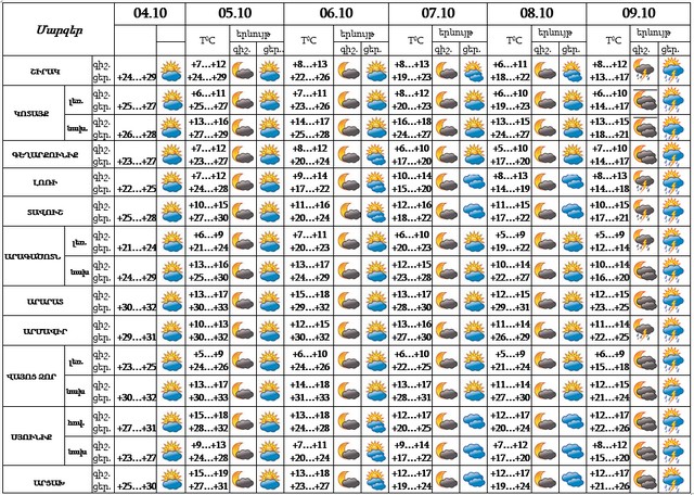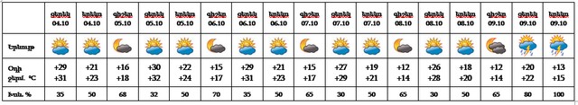 Հոկտեմբերի 04-ի ցերեկը, 05-08-ին սպասվում է առանց տեղումների եղանակ: Հոկտեմբերի 09-ին ցերեկը ժամանակ առ ժամանակ սպասվում է անձրև և ամպրոպ: