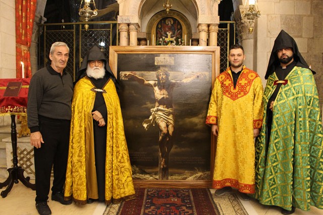 – Այս նկարի պատմությունը ունի նախաբան, բայց ես կուզեի անդրադառնալ կարեւորին: Կանադայի hայոց թեմից Տեր Կոմիտաս քահանա Միրզախանյանի միջնորդությամբ ծանոթացա Երուսաղեմի Սբ. Հարության Տաճարի տեսուչ, Հոգեշնորհ Հայր Սամուել Ծայրագույն վարդապետ Աղոյանի հետ: Հայր սուրբից տեղեկացա, որ Հարության Տաճարի հայկական մասի համար Քրիստոսի խաչելության նկար է հարկավոր: Այդ հարցով դիմեցին ինձ, որ էսքիզներ ներկայացնեմ, քանի որ տեսել էին Մայր Աթոռի համար արած իմ աշխատանքները:
