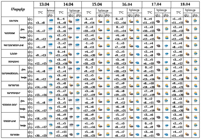 Ապրիլի 13-ի ցերեկը, 14-ին շրջանների զգալի մասում, 17-18-ին կեսօրից հետո՝ առանձին շրջաններում սպասվում են տեղումներ և ամպրոպ։ Ապրիլի 13-14-ին լեռնային առանձին շրջաններում տեղումները սպասվում են թաց ձյան տեսքով։ Ապրիլի 15-16-ին սպասվում է առանց տեղումների եղանակ։ Քամին՝ արևմտյան՝ 4-6 մ/վրկ, 13-15-ին առանձին վայրերում սպասվում է քամու ուժգնացում՝ 15-20 մ/վրկ արագությամբ: Օդի ջերմաստիճանը ապրիլի 13-ին, 14-ի գիշերը աստիճանաբար կնվազի 5-7 աստիճանով, 15-16-ին նույնքան կբարձրանա։