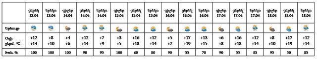Ապրիլի 13-ին կեսօրից հետո, 14-ին սպասվում է, 17-18-ին երեկոյան ժամերին հնարավոր է անձրև և ամպրոպ, ամպրոպի ժամանակ քամու ուժգնացում՝ 13-16 մ/վրկ արագությամբ։ Ապրիլի 15-16-ին սպասվում է առանց տեղումների եղանակ։