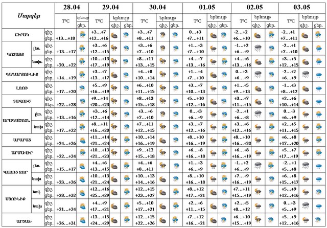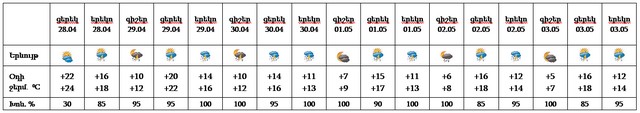 Ապրիլի 28-ի ցերեկը և երեկոյան ժամերին առանձին շրջաններում սպասվում է կարճատև անձրև և ամպրոպ։ Ապրիլի 29-30-ին, մայիսի 1-3-ին շրջանների զգալի մասում սպասվում է անձրև և ամպրոպ։