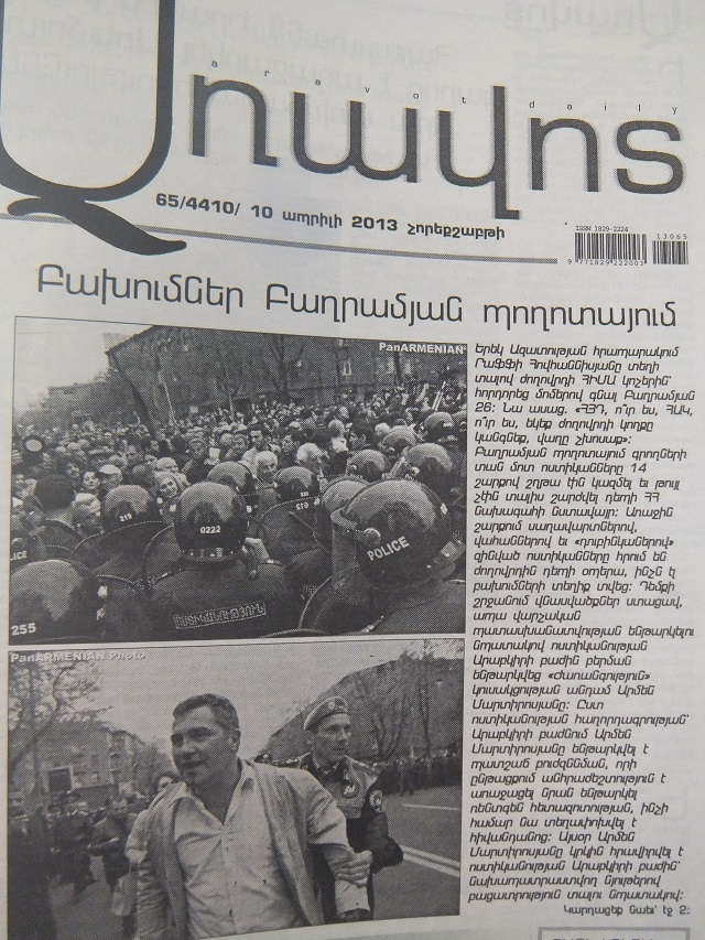 Այդ օրը «Առավոտը» տեղեկացրեց, որ ՀՀ վարչական դատարանն ավարտել է Ինֆորմացիայի ազատության կենտրոնի (դատավոր՝ Ա. Միրզոյան) հայցն «Աշտարակ Կաթ» ՓԲ ընկերության դեմ: Դատարանն ամբողջությամբ մերժեց ԻԱԿ-ի հայցը: Մենք հիշեցրել էինք, որ 2011թ. նոյեմբերի 12-ին Ինֆորմացիայի ազատության կենտրոնը տեղեկատվություն ստանալու հարցմամբ դիմել էր «Աշտարակ-Կաթ» ՓԲ ընկերությանը, խնդրելով հայտնել. «1. Կազմակերպության կաթնամթերքը արտադրվում է բնակա՞ն կաթից, թե՞ կաթնափոշուց, 2. տրամադրել ցանկը, թե կազմակերպության կաթնամթերքներից ո՞րն է բնական կաթից, որը՝ ոչ»: Հայաստանի ուժեղագույն սամբիստներն ապրիլի 1-ին մեկնեցին Ստեփանակերտ, ուր տեղի էր ունենալու Հայաստանի սամբոյի տղամարդկանց 2013թ. առաջնությունը: Ստորեւ ներկայացնում ենք ամենաուշագրավ իրադարձությունների «Ծաղկաքաղը»: