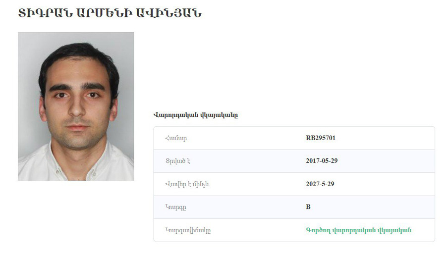 Սիվիլնեթը ոստիկանության համապատասխան բազայից ձեռք է բերել Տիգրան Ավինյանի կողմից տրանսպորտային միջոցներ վարելու իրավունքների մասին տեղեկություններ։ Այդ տվյալների համաձայն՝ նա ունի B կարգի վարորդական վկայական, որը ստացել է 2017-ին։