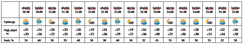 Oգոստոսի 20-ի, 21-ին, 23-25-ին կեսօրից հետո, 22-ին գիշերը և կեսօրից հետո առանձին շրջաններում սպասվում է կարճատև անձրև և ամպրոպ, տեղ-տեղ հնարավոր է կարկուտ։ Քամին՝ հարավարևմտյան 2-5 մ/վրկ, ամպրոպի ժամանակ սպասվում է քամու ուժգնացում 18-22 մ/վրկ արագությամբ։ Օդի ջերմաստիճանն օգոստոսի 20-ին կնվազի 2-3 աստիճանով, 21-22-ին աստիճանաբար նույնքան կբարձրանա: