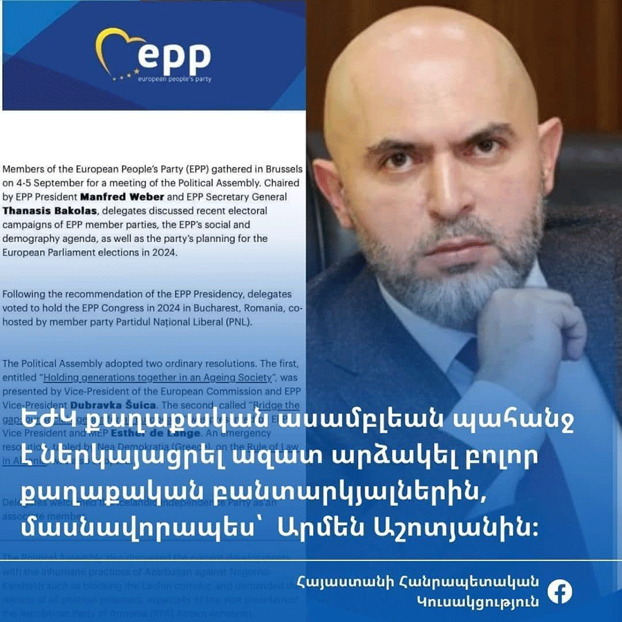 «Եվրոպական Ժողովրդական կուսակցության քաղաքական ասամբլեան, իր եզրափակիչ հաղորդագրությամբ ամրագրեց, որ ՀՀԿ փոխնախագահ Արմեն Աշոտյանը քաղբանտարկյալ է: